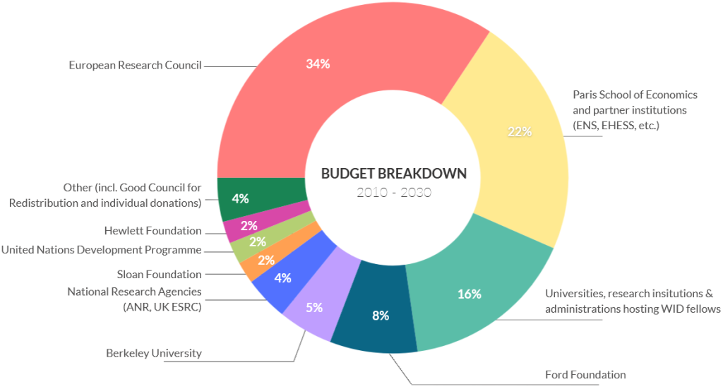 The World Inequality Lab (WIL) currently operates with an annual budget of about 1.2-1.3 million euros, mainly sourced from public research institutions, public organizations, and non-profit organizations.